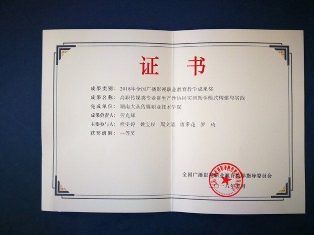 教学成果《高职传媒类专业群生产线协同实训教学模式构建与实践》获2018年全国广播影视职业教育教学成果奖一等奖。