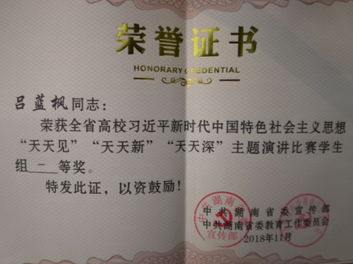 广播电视技术1601班学生吕蓝枫在2018年全省高校习近平新时代中国特色社会主义思想“天天见”“天天新”“天天深”主题演讲总决赛中荣获一等奖。