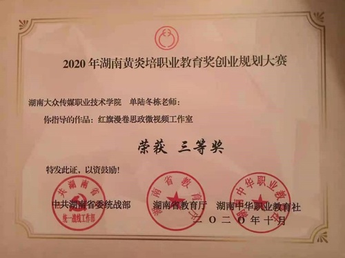 新闻采编与制作专业老师带领学生在2020年第六届湖南省黄炎培教育奖创业规划大赛中获得三等奖。