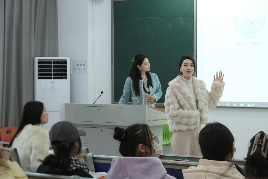 随后,公司招聘专员结合爆款案例向大家详细介绍了门牙视频的五大赛道,分别是美妆、母婴、汽车、家居和短剧。雷舒婷通过对企业核心数据、发展历程、红人案例三个方面的拆解阐述,向在场学生展示了门牙视频极高的企业价值,并表达了门牙视频“以创新为导向,以内容为核心”的发展愿景,传送了公司近期正在进行的短剧项目和职位空缺的信号,呼吁我校毕业生积极参与公司的就业招聘。