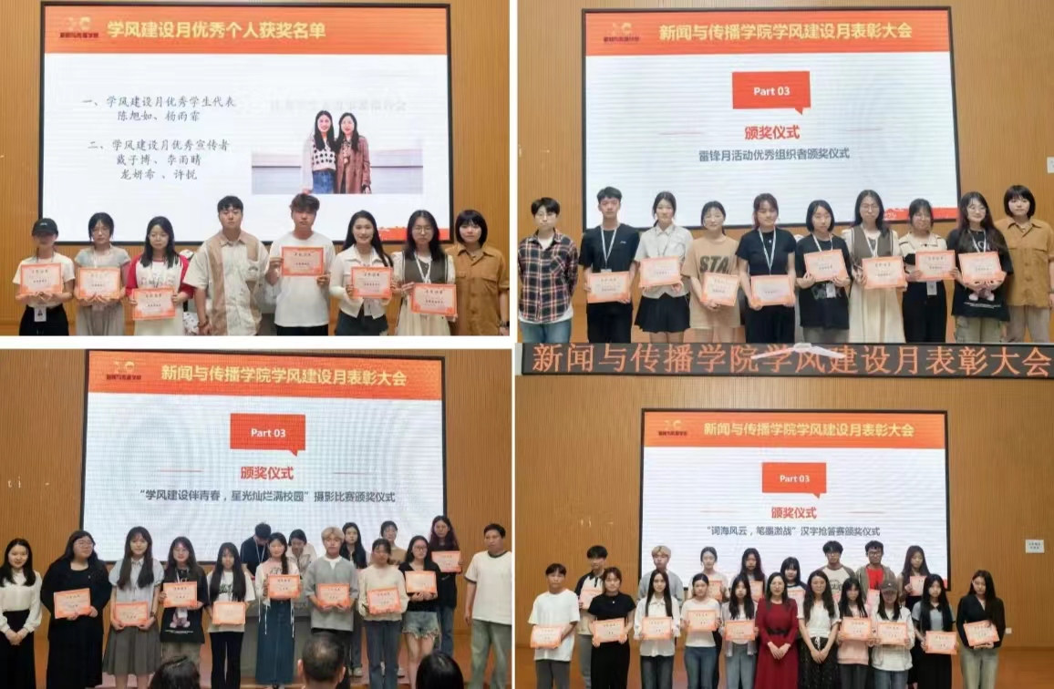 为建设学院优良学风,鼓励学生奋发向上,砥砺前行,新闻与传播学院2024年4月29日在教学楼D101教室召开学风建设月表彰大会。新闻与传播学院党总支书记刘小华,学工办主任李艳梅,团总支书记邓芳芳,大一大二全体辅导员,团学会成员,学风建设月获奖学生代表出席了本次会议。