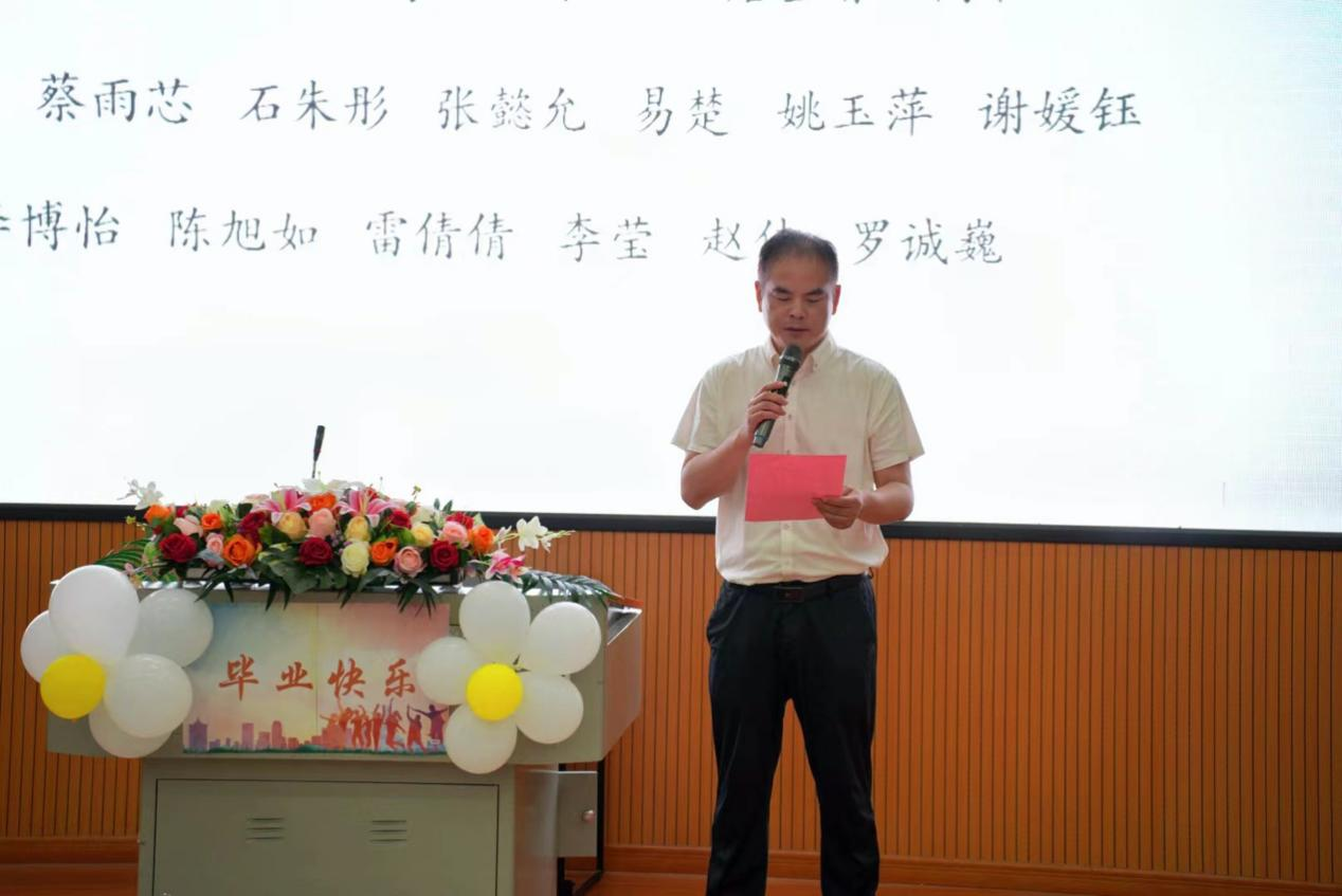 党总支书记刘小华上台宣布了省级和校级优秀毕业生名单,并对他们取得的优异成绩表示祝贺。副校长雷珺麟和学工部部长彭涛为他们颁奖。这些荣誉不仅是对他们过去努力的肯定,更是对他们未来的鼓励和期待。