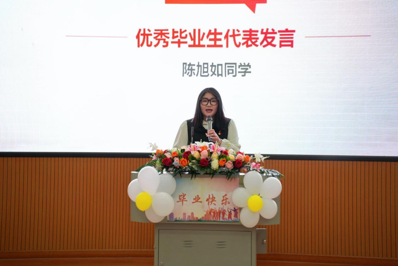 优秀毕业生陈旭如上台发言。她感慨大学三年时光飞逝,同时也表达了对未来的美好憧憬。她代表全体毕业生感谢学校的培养、老师的教导以及同学们的陪伴与帮助,并表示将珍惜这段美好的时光,更加坚定地走向未来。