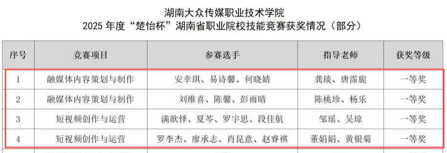近日,2025年度“楚怡杯”湖南省职业院校技能大赛圆满落幕。我院在融媒体内容策划与制作、短视频创作与运营两个赛项中表现出色,共获得一等奖4项,成绩斐然。