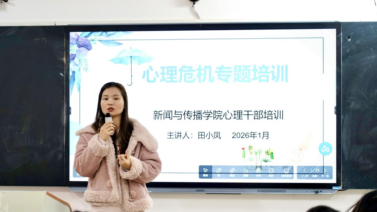 为加强心理健康教育学生工作队伍建设,提升学生干部心理危机识别与干预能力,1月5日,新闻与传播学院在一体化102教室举办心理危机专题培训,并同步召开2025年度心理干部表彰大会。本次培训由学院心理专干田小凤老师主讲,全院大一心理委员、心理部干事及各班级班长共同参与。